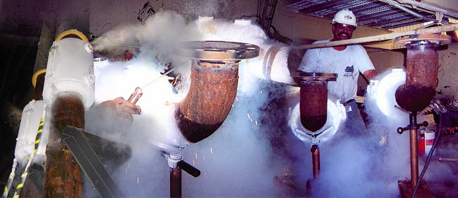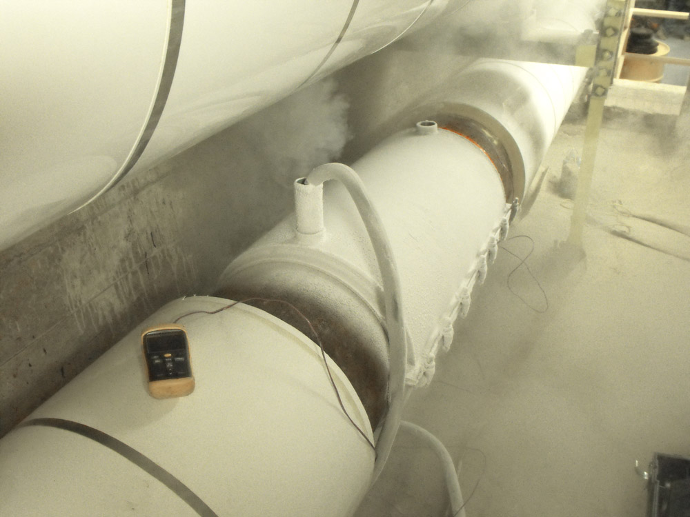 Pipe freeze plug technology is a simple, cost-effective method to perform pipeline maintenance or modifications without draining. Using liquid nitrogen or CO2 to isolate the problem area in the pipeline by freezing the product inside the pipe to form one or more solid pipe freeze plugs. This allows for very little drain-down or refill, having to bleed problematic air out of pipes during refills, and in many cases, no system downtime. Once the pipe work is complete, the freeze plugs are thawed and are back in operation. Standard pipe freeze plugs range in size from 1/2" to 36" outside diameter (OD) and can be performed on most fluids. Freeze plugs are constantly monitored and are designed to withstand up to 3,000 PSI line pressure. Independent laboratory tests have documented that no physical change in the structural integrity of the pipe occurs due to the controlled freezing process using liquid nitrogen. Another benefit of pipe freeze plugs over the mechanical line stopping method is that there are no bulky fittings left behind on the pipeline system and can be performed in tight locations.
