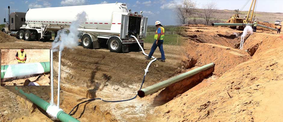 In the picture above: The pipeline apparently had a pinhole leak somewhere in a 20-mile stretch. To find the leak, IFT was called to perform FreezePlugs to determine the location of this leak. Kind of like finding a needle in a haystack when the pipe is buried.